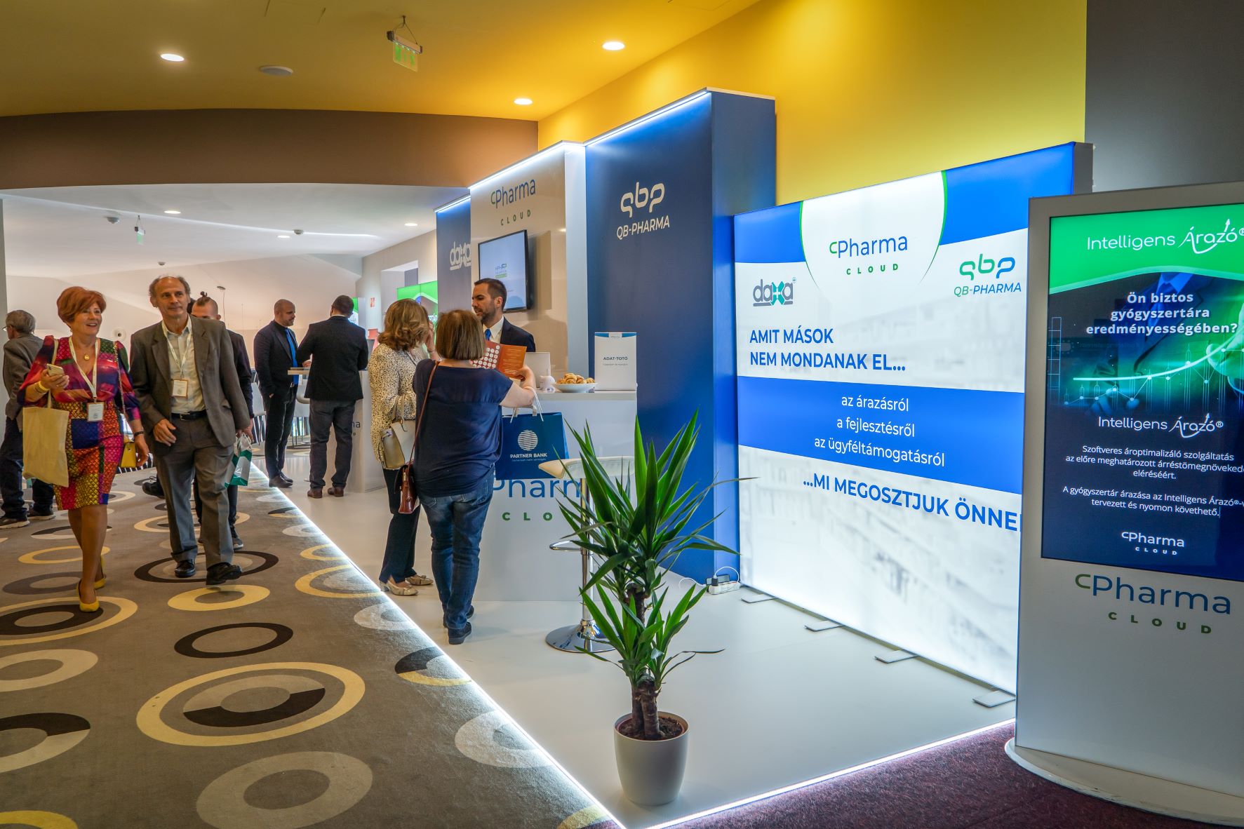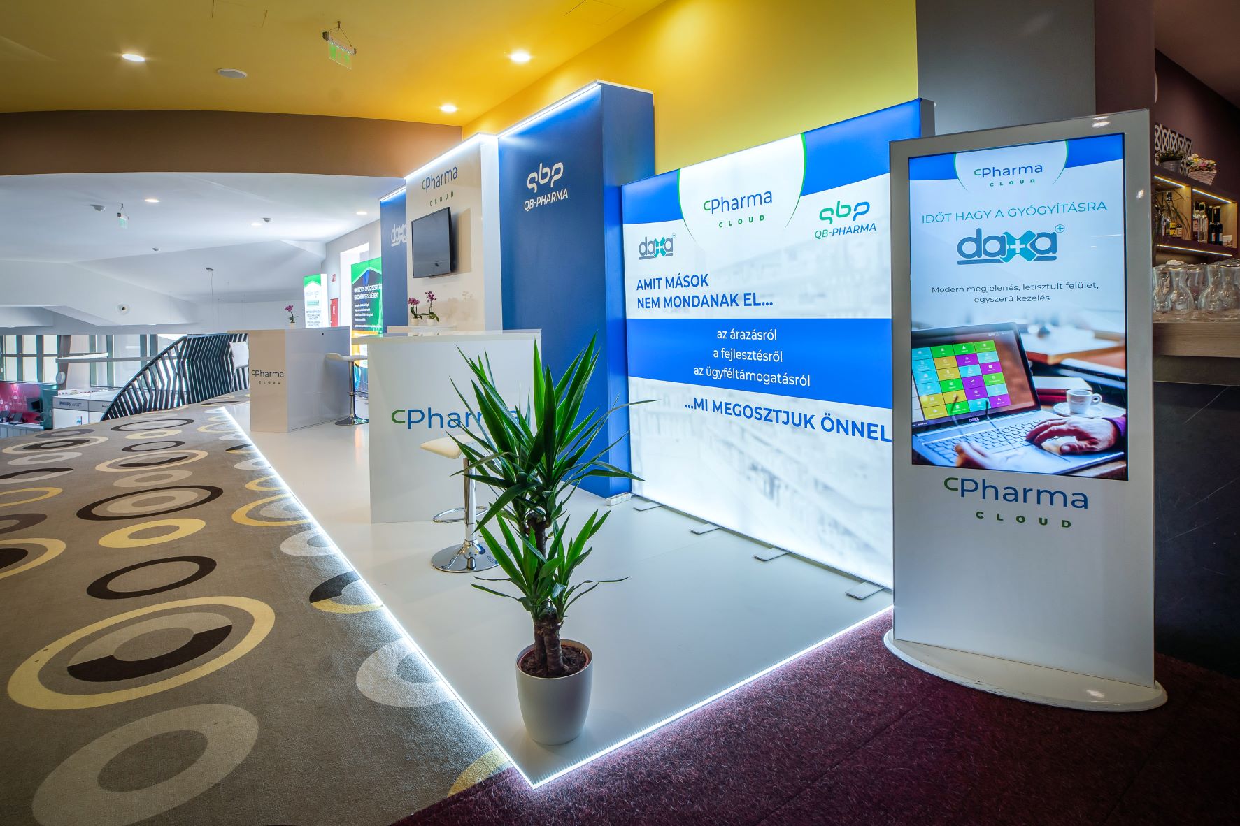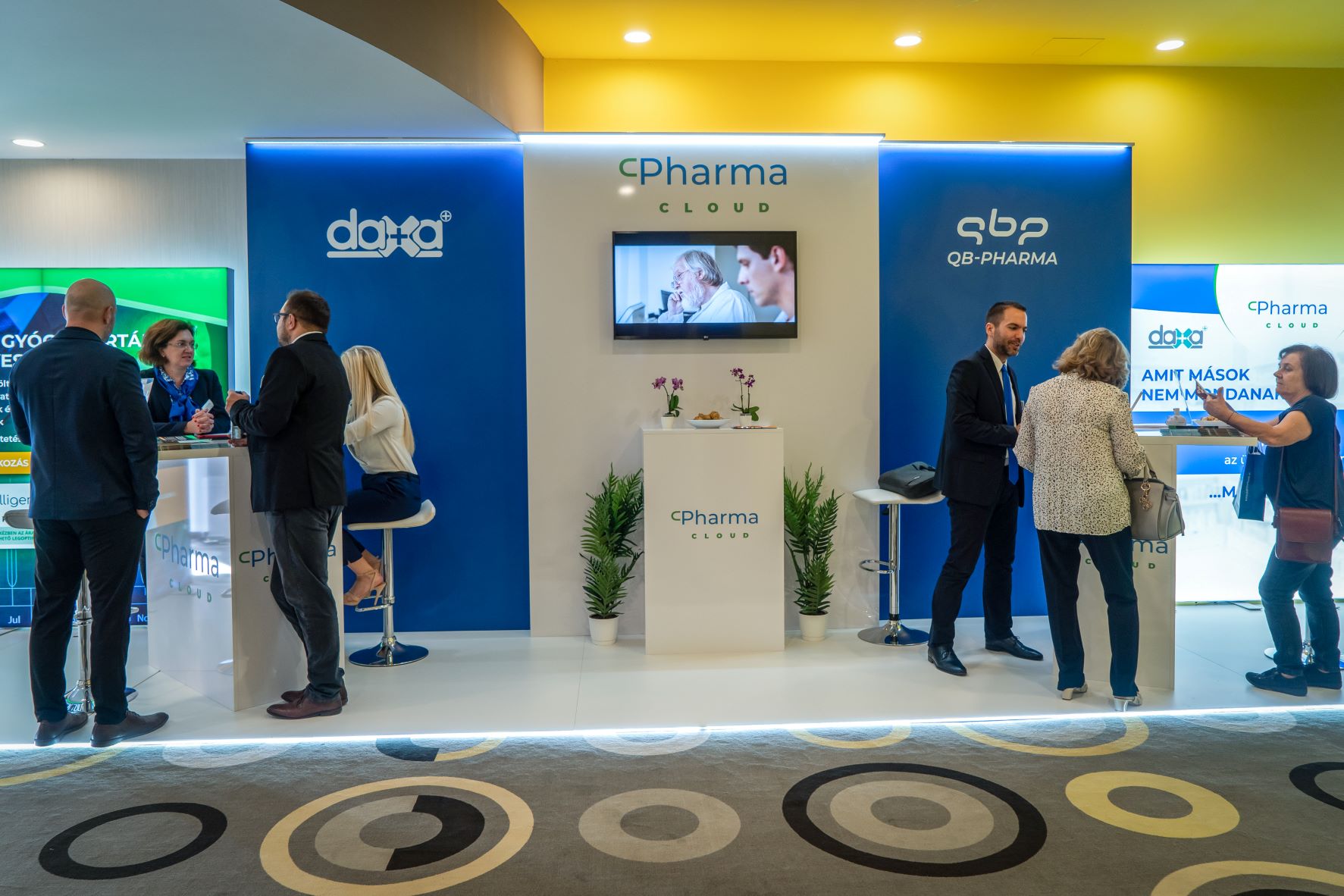 A Pharma Cloud standján négy beszélgetőpont került kialakításra, ahol a daxa™ és QB-Pharma szoftverekhez kapcsolódó kérdésekről, valamint a gyógyszertárakat érintő üzleti témákról beszélgethettek a látogatók a cég vezető szakembereivel. A személyes jelenlét számtalan lehetőséget biztosított, hogy a vállalat szolgáltatási köreivel, valamint a patikák napi munkáját és ügyvitelét támogató, rendszerszintű kialakításokkal megismerkedjenek az érdeklődők. A szoftverek előnyein, sajátosságain és a bennük lévő lehetőségeken túl fejlesztési kérdések és a napi munkát érintő témák is előtérbe kerülhettek.